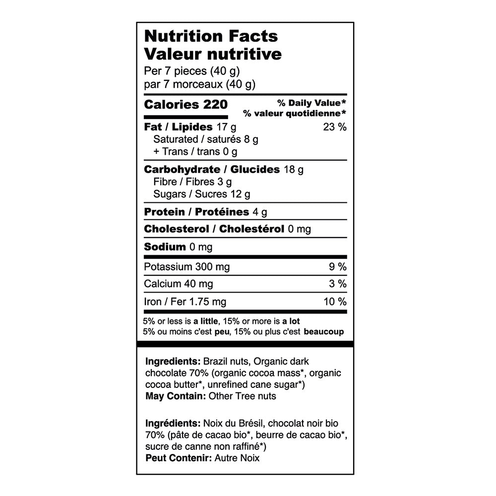 - Toasted Brazil nuts coated in Peruvian 70% dark chocolate