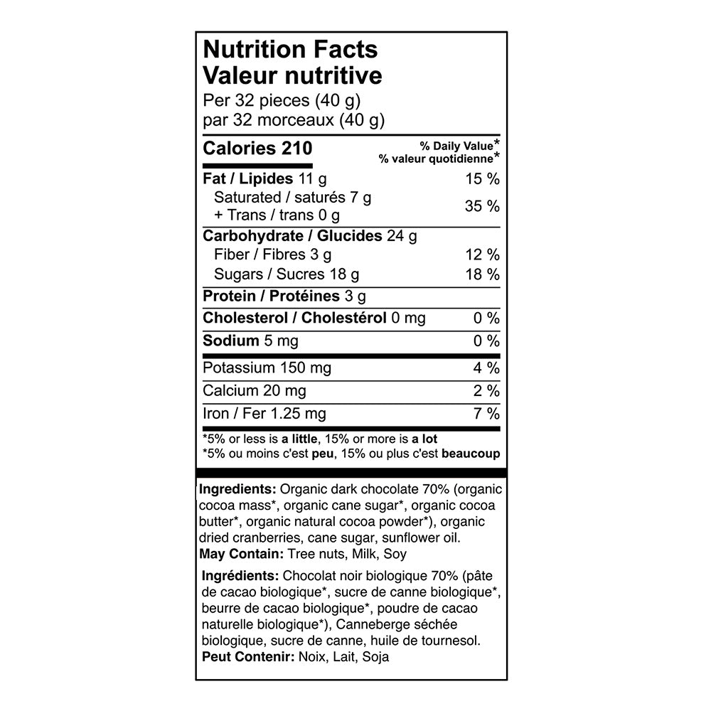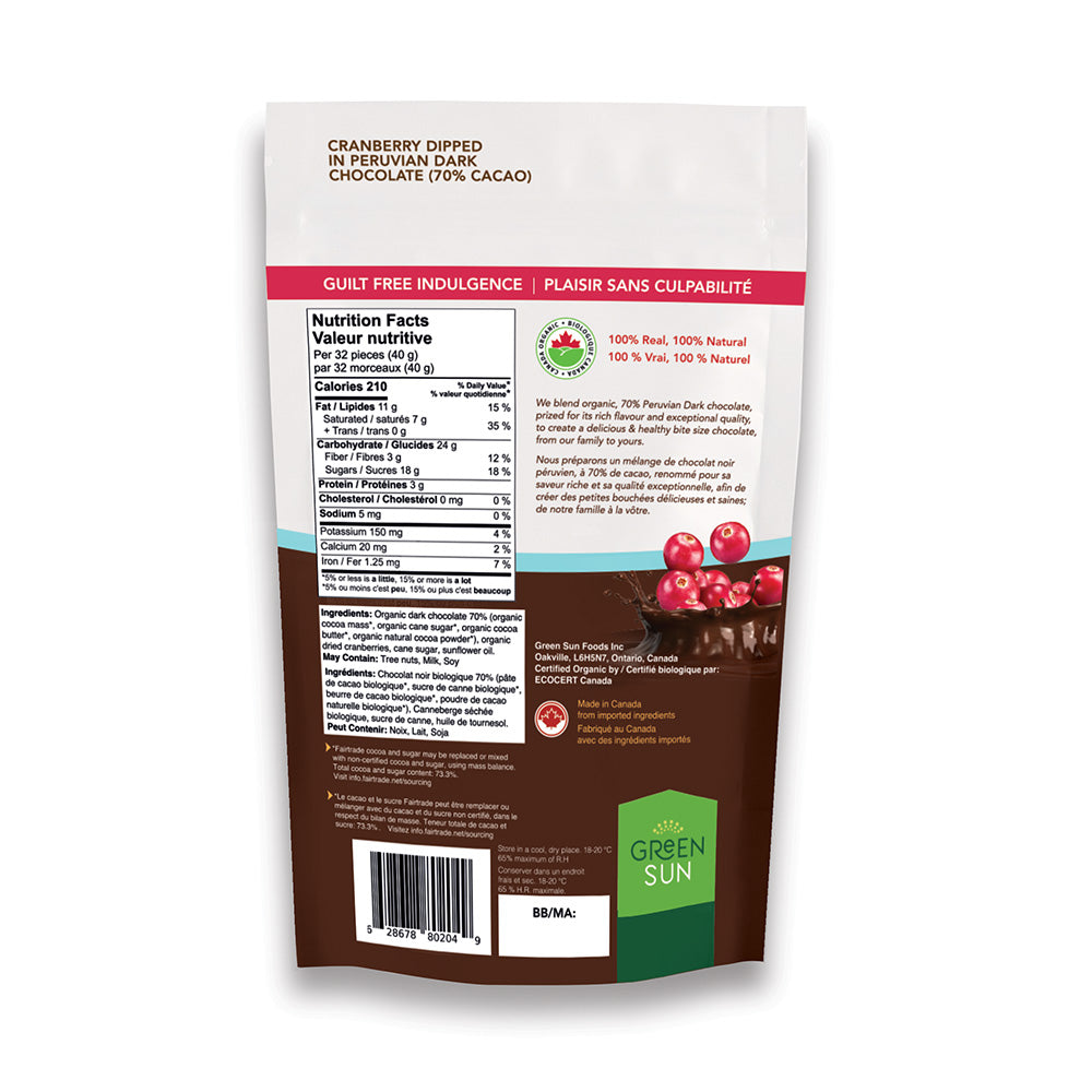 - Real cranberries paired with premium Peruvian 70% dark chocolate