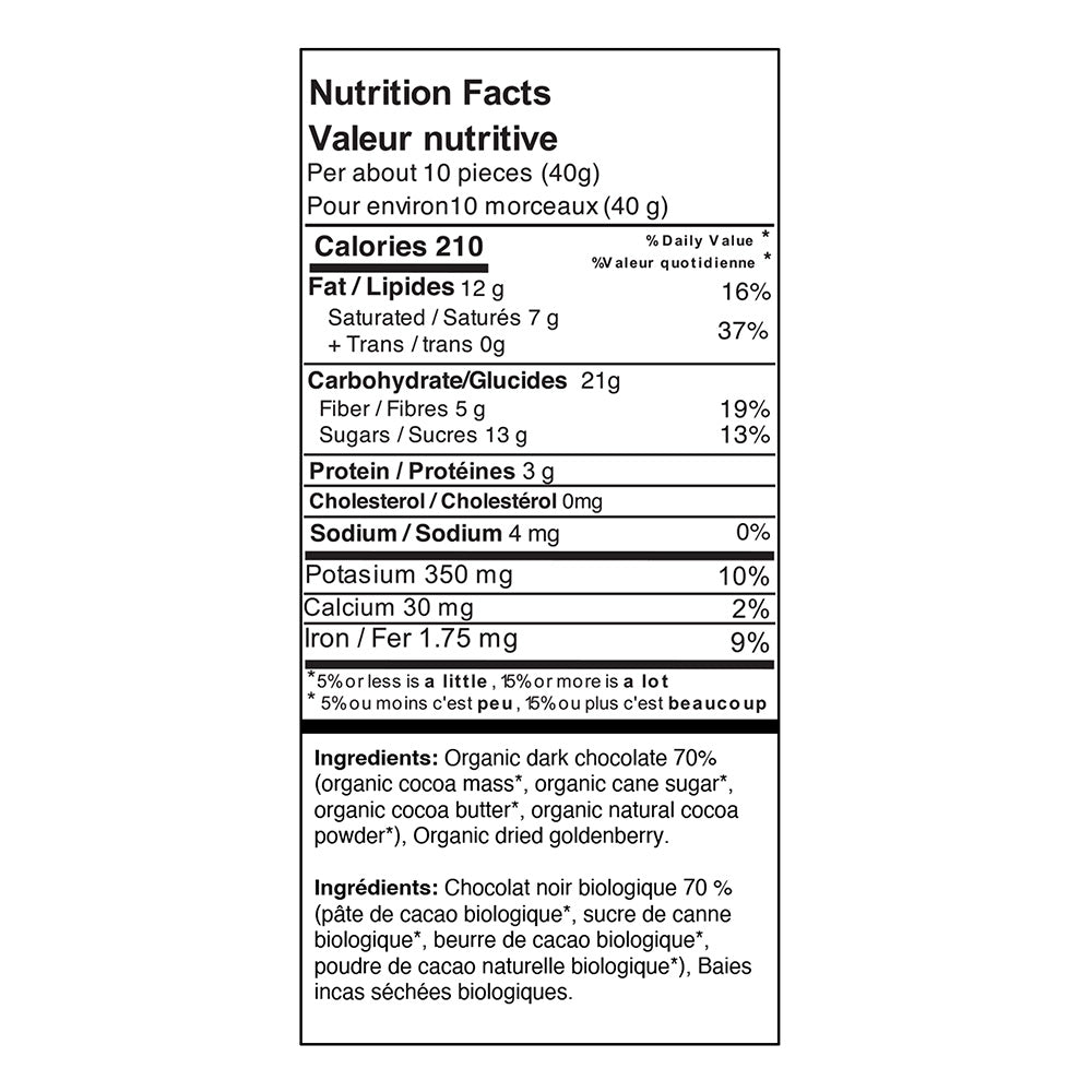 - Real goldenberries paired with premium Peruvian 70% dark chocolate